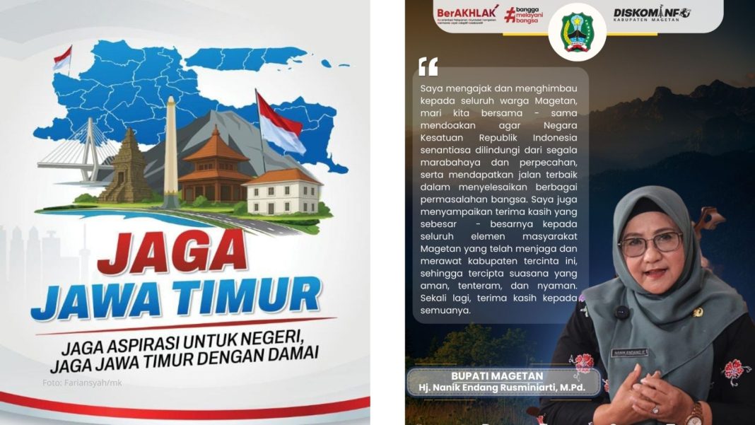 “Saya mengajak semua elemen masyarakat menjaga dan merawat kabupaten kita tercinta sehingga terus tercipta situasi yang aman, tenteram, dan nayaman,” katanya, Minggu (31/8/2025) seperti dikutip dari Diskominfo Magetan.