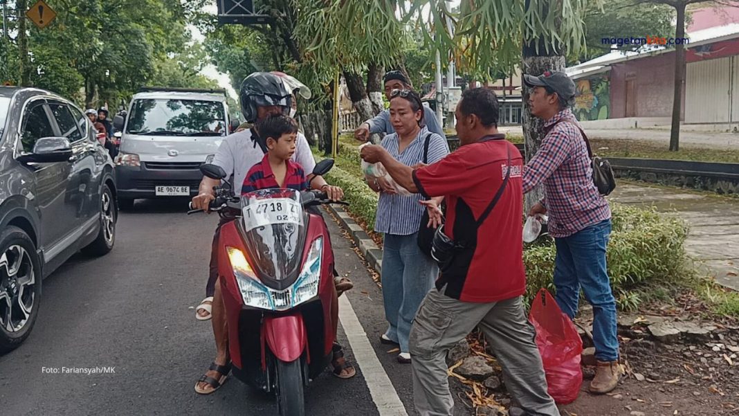 Mereka membagikan sebanyak 2.000 paket takjil dan 100 paket sembako. Pembagian dilakukan secara langsung kepada pengendara dan warga yang melintas di pertigaan lampu merah jalan Pahlawan, seberang pos polisi stadion Magetan.