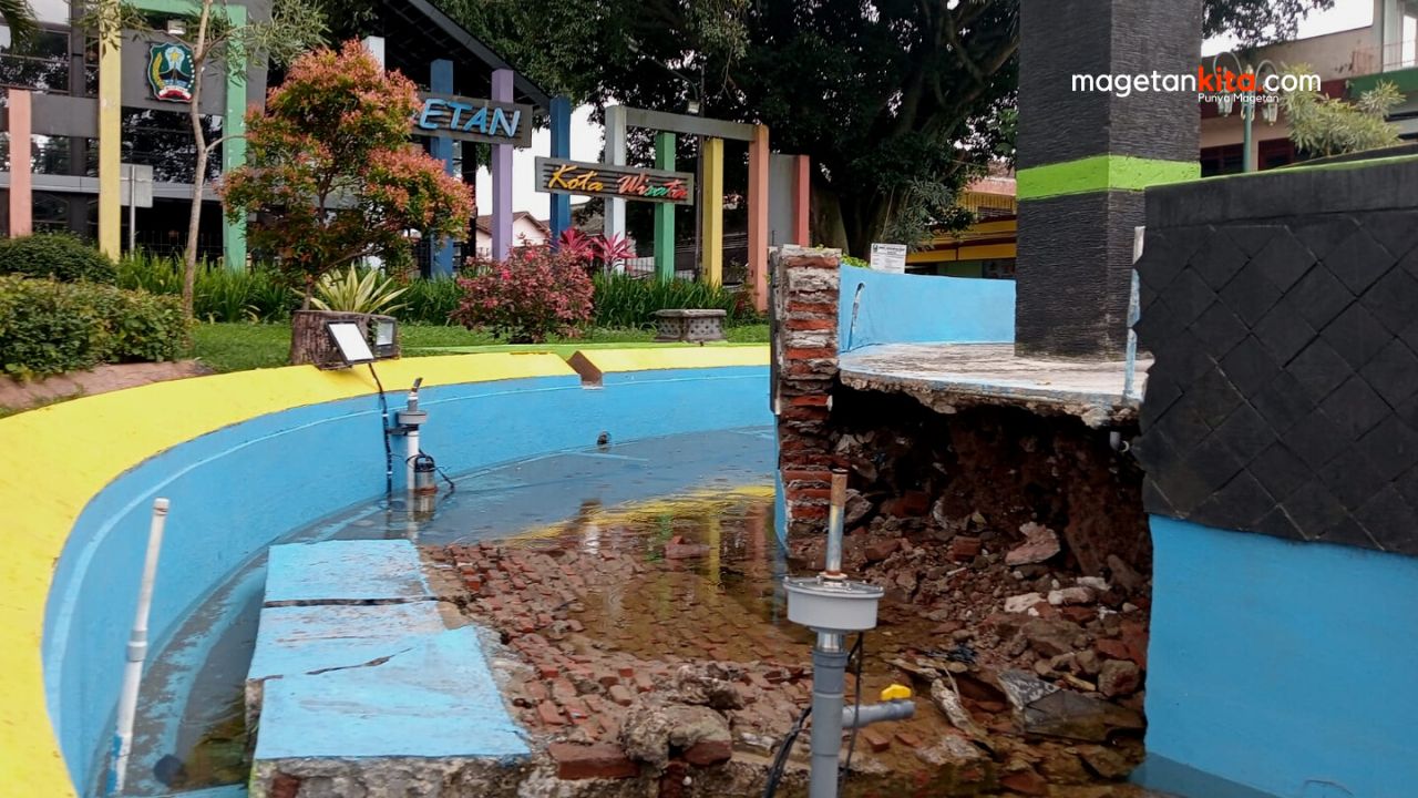 Magetan – Dinding penahan air mancur di kawasan timur Pasar Baru, ambrol. Ambrolnya tembok salah satu ikon Magetan tersebut, informasinya terjadi di malam pergantian tahun 2022/2023 lalu.